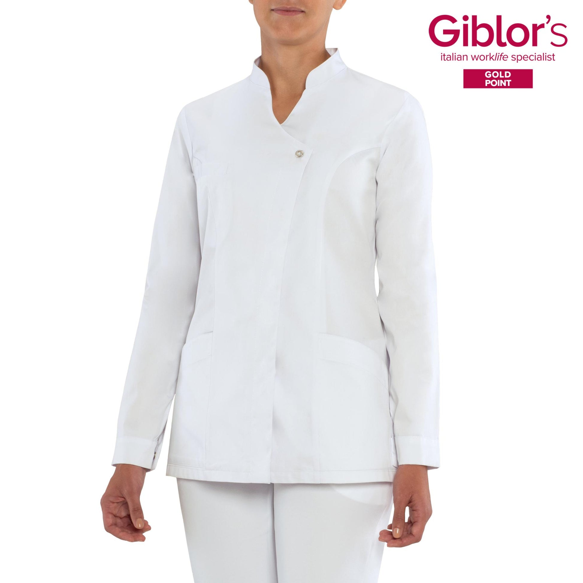 La Casacca Gioia a manica lunga ha vestibilità aderente ed è proposta nei colori rosso e grigio, per un look professionale e trendy. Realizzata in tessuto satin policotone 180 gr, morbido al tatto, di facile stiro, è adatta ai lavaggi ad alte temperature e al candeggio. Il collo alla coreana e l’allacciatura alla francese, con abbottonatura nascosta, creano una forma a goccia al centro del collo e ne valorizzano la femminilità. Un taschino sul petto e due tasche laterali completano il capo. La parte posteriore è sagomata da 2 tagli.