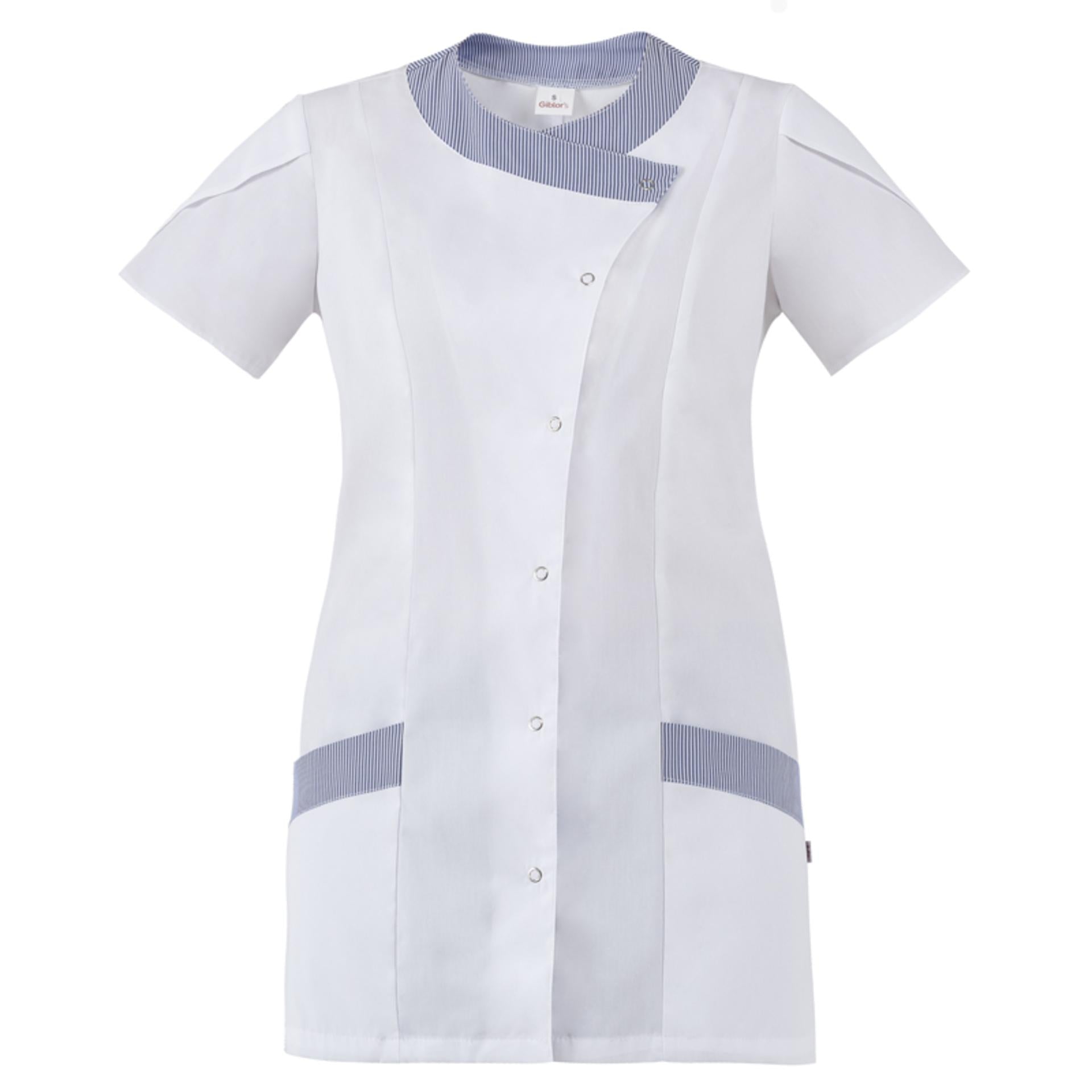 La casacca da lavoro Horeca Giselle è una variante della più classica casacca Monica, arricchita di dettagli quali manichina ad aletta e - per la variante in bianco - bordo delle tasche in abbinamento al collo. In morbido e freschissimo poliestere misto cotone, ha una linea slim accentuata da tagli strategici.Disponibile in due varianti di colore: bianco e rigato azzurro con finiture a contrasto. Questa casacca da donna presenta comode tasche laterali ed un'abbottonatura con automatici in nickel dallo stile geometrico, che conferiscono luce ed eleganza al capo.