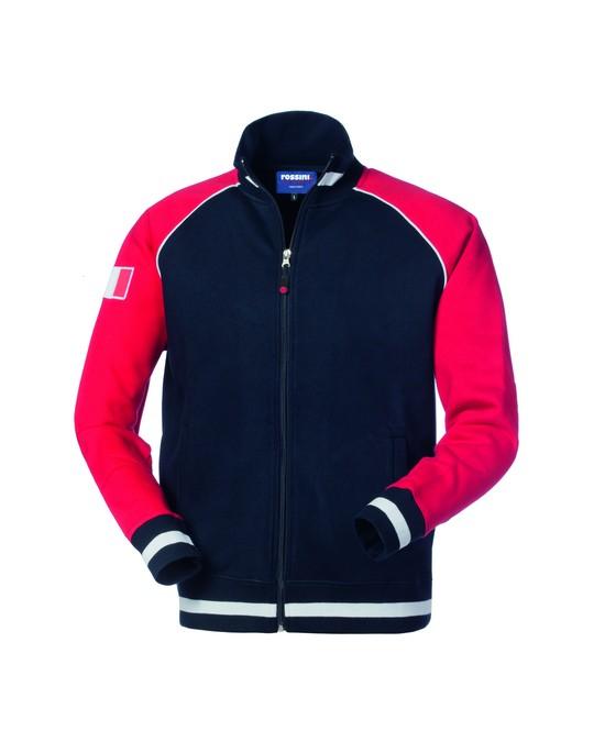 Felpa con chiusura centrale con cerniera, parasudore interno al collo, maniche raglan di colore a contrasto profilate con coda di topo bianca. Polsi, collo e fascia in girovita in maglia elastica, due tasche inferiori a filetto, scudetto tricolore applicato su manica destra. 70% cotone, 30% poliestere. Peso 310 g/m². Con garzatura I^ Categoria per rischi minimi