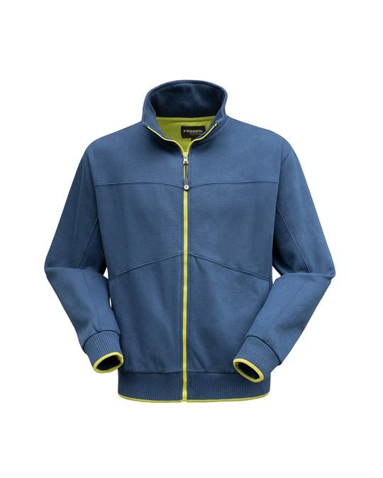 Felpa con collo alto con chiusura centrale con cerniera in plastica di colore a contrasto. Fascia parasudore e lunetta nella parte posteriore del collo di colore a contrasto, polsi e fascia girovita in maglia elastica con bordo di colore a contrasto. Esclusive cuciture a cavallo dei tagli a carré anteriore e posteriore, lungo le maniche e sull'inserto obliquo davanti, due tasche anteriori a filetto. 50% cotone, 50% poliestere riciclato. Peso 285 g/m². Con garzatura I^ Categoria per rischi minimi