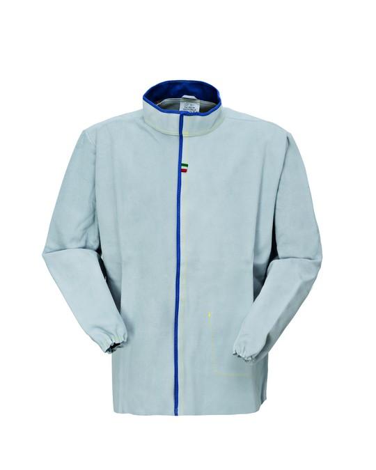 Giacca in crosta con collo alla coreana, chiusura centrale con velcro, elastico ai polsi, fori di areazione sotto le ascelle. TAGLIA 54. II^ Categoria EN ISO 13688:2013 EN ISO 11611:2015 CLASSE 2 A1
