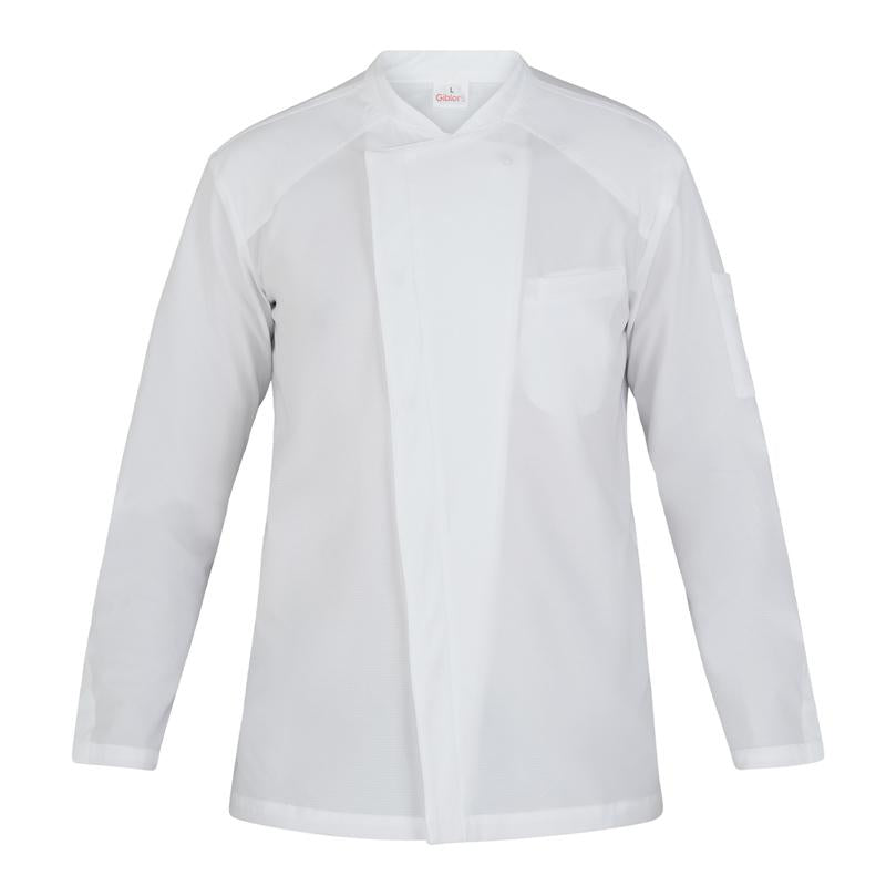 La giacca Diego di Giblor's è il capo ideale per i professionisti del settore food che cercano un look eclettico e raffinato. L'innovativo tessuto è realizzato con filato Sorona® dalle performance uniche che conferisce al capo: morbidezza ed elasticità meccanica, ha l'armatura ripstop, caratterizzata da una resistenza superiore agli strappi e alle abrasioni. Frutto di una ricerca e sperimentazione sui tagli moderni, questa giacca presenta un caratteristico colletto coreano slim, i cui apici si uniscono nel centro del davanti. Il capo presenta inoltre una doppia abbottonatura nascosta con automatici, una doppia impuntura a due aghi e spalloni pronunciati sul davanti, che incorniciano il collo ed evidenziano il torace. Completano la giacca un taschino lato cuore e un porta penne personalizzato con un ricamo "G" sul braccio. La manica lunga leggermente asciugata presenta una chiusura con due automatici nascosti, che permettono l'apertura per un eventuale arrotolamento della stessa. L'intera giacca è contraddistinta da impunture a due aghi, mentre i due tagli nel dietro asciugano la linea e i due spacchi classici "tipo giacca" ne facilitano il movimento. Il fit Giblor's garantisce inoltre comfort e vestibilità impeccabile.