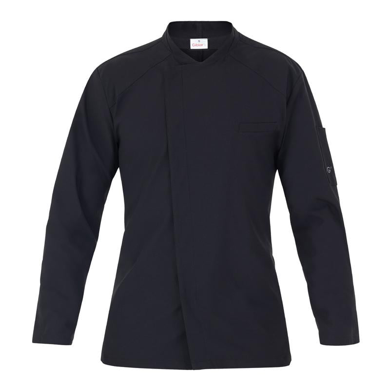 La giacca Diego di Giblor's è il capo ideale per i professionisti del settore food che cercano un look eclettico e raffinato. L'innovativo tessuto è realizzato con filato Sorona® dalle performance uniche che conferisce al capo: morbidezza ed elasticità meccanica, ha l'armatura ripstop, caratterizzata da una resistenza superiore agli strappi e alle abrasioni. Frutto di una ricerca e sperimentazione sui tagli moderni, questa giacca presenta un caratteristico colletto coreano slim, i cui apici si uniscono nel centro del davanti. Il capo presenta inoltre una doppia abbottonatura nascosta con automatici, una doppia impuntura a due aghi e spalloni pronunciati sul davanti, che incorniciano il collo ed evidenziano il torace. Completano la giacca un taschino lato cuore e un porta penne personalizzato con un ricamo "G" sul braccio. La manica lunga leggermente asciugata presenta una chiusura con due automatici nascosti, che permettono l'apertura per un eventuale arrotolamento della stessa. L'intera giacca è contraddistinta da impunture a due aghi, mentre i due tagli nel dietro asciugano la linea e i due spacchi classici "tipo giacca" ne facilitano il movimento. Il fit Giblor's garantisce inoltre comfort e vestibilità impeccabile.