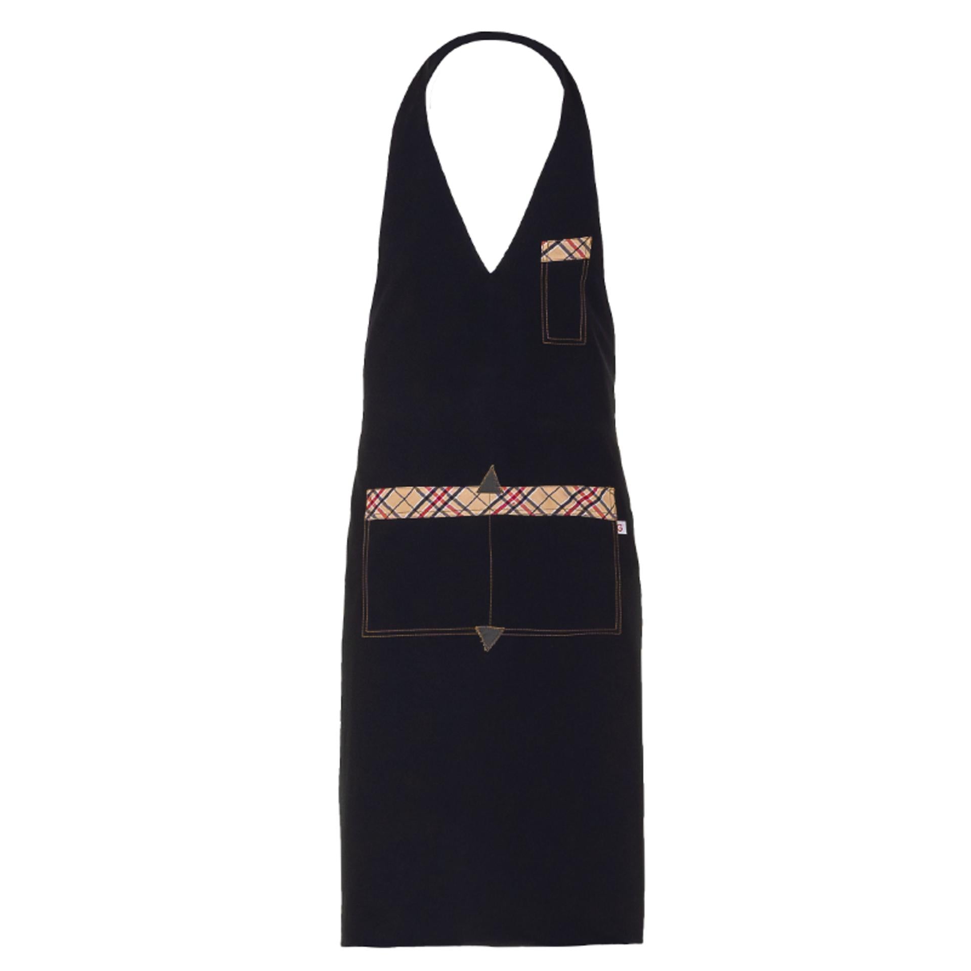 l grembiule con pettorina Madras fa parte della linea dal gusto scozzese. Sullo stile dei grembiuli classici da sala è un modello lungo, caratterizzato da un portapenne e una grande tasca centrale divisa in due che predomina al centro del grembiule.I contrasti nelle rifiniture delle tasche e del portapenne hanno una posizione obliqua che conferisce un tocco di anticonformismo ad un capo classico, reso fashion anche dalle doppie cuciture con filato 30 e dai triangoli in finta pelle che marcano gli elementi.