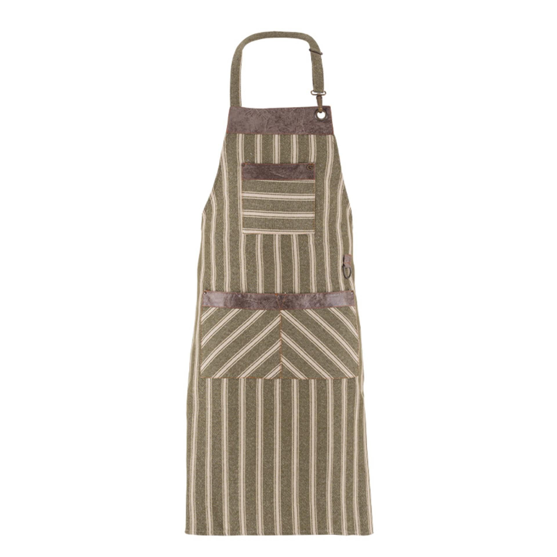 Il grembiule Oregon, dinamico e moderno, è pensato per ambienti dal gusto provenzale e dallo stile country chic. Molto ricercato nel suo genere, viene proposto in una nuovissima variante verde militare. Si tratta di un capo assemblato con impunture a due aghi in tono, proposto con giochi di righe verticali, orizzontali ed oblique. La tracolla è fissata al capo da un lato attraverso un grande anello porta torcione, mentre dall'altro una vela ed un gancio importante caratterizzano la chiusura regolabile. Borchie in ottone anticato ancorano la grande tasca centrale ed il taschino sul petto, personalizzato dal rivetto