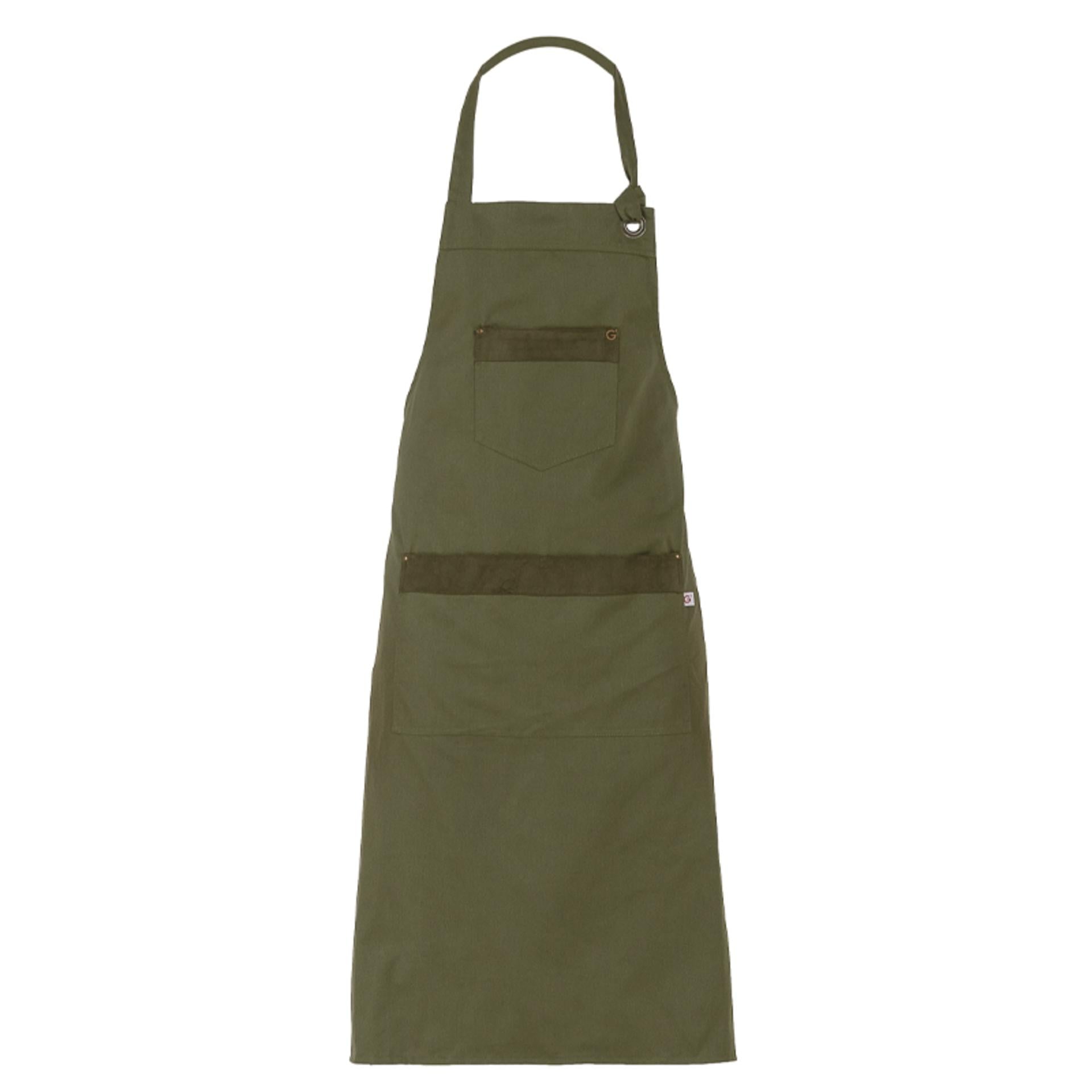 Il grembiule con pettorina Ryan, moderno e di sicuro effetto estetico, unisce essenzialità e cura dei dettagli in un unico capo. Questo grembiule da lavoro dalle dimensioni ampie ha una allacciatura regolabile mediante una vela in ottone anticato, una grande tasca centrale divisa da un'impuntura a due aghi e una tasca sul centro della pettorina. Completamente ribattuto con impunture a due aghi, è impreziosito da diversi rivetti posti come ancoraggio sulle tasche. Il materiale è un resistente poliestere misto cotone, impreziosito da inserti di alcantara in tinta. Le due versioni disponibili sono in nero o in un raffinato color verde militare, entrambe caratterizzate dall'immancabile logo "G'" in ottone, che contribuisce ad illuminare il capo.