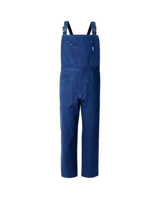 Pettorina da lavoro con chiusura della patta con bottoni, apertura laterale chiusa con bottone, elastico in vita, fibbie in plastica, due tasche anteriori, 1 tasca posteriore applicata a destra chiusa con bottone, un tascone applicato chiuso con cerniera, taschino metro. Drill 3/1, 100% cotone irrestringibile, peso 260 g/m2 I^ Categoria rischi minimi