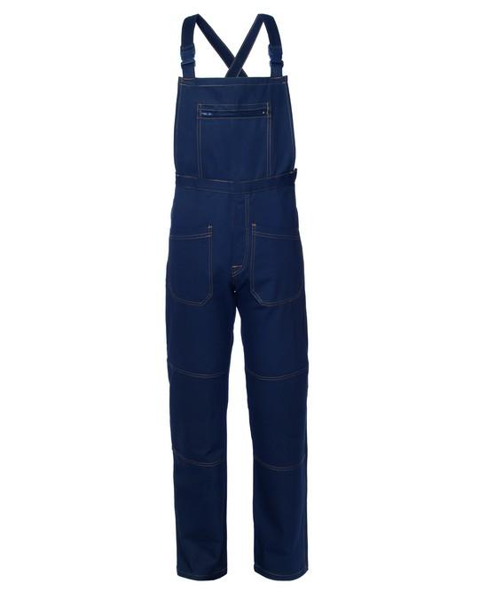 Pettorina da lavoro, bretelle incrociate con elastico interno e fibbie in plastica, con elastico in vita posteriore, chiusura alla patta con bottoni. Un tascone al petto chiuso con cerniera, due tasche anteriori, una tasca posteriore chiusa con bottone, un porta metro su gamba destra. Apertura laterale a destra chiusa con bottone, cuciture di colore a contrasto. Drill 3/1, 100% cotone irrestringibile. Peso 280 g/m² I^ Categoria per rischi minimi