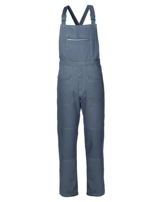Pettorina da lavoro, bretelle incrociate con elastico interno e fibbie in plastica, con elastico in vita posteriore, chiusura alla patta con bottoni. Un tascone al petto chiuso con cerniera, due tasche anteriori, una tasca posteriore chiusa con bottone, un porta metro su gamba destra. Apertura laterale a destra chiusa con bottone, cuciture di colore a contrasto. Drill 3/1, 100% cotone irrestringibile. Peso 280 g/m² I^ Categoria per rischi minimi