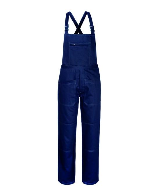 Pettorina da lavoro con chiusura alla patta con bottoni, apertura laterale a destra chiusa con bottone, bretelle incrociate in tessuto con elastico interno e fibbie in plastica. Un tascone applicato al petto chiuso con cerniera, due tasche anteriori applicate, un portametro applicato su gamba destra, una tasca posteriore applicata a destra chiusa con bottone, cuciture a contrasto di colore grigio. 100% cotone. Peso 340 g/m². Garzatura interna I^ Categoria per rischi minimi