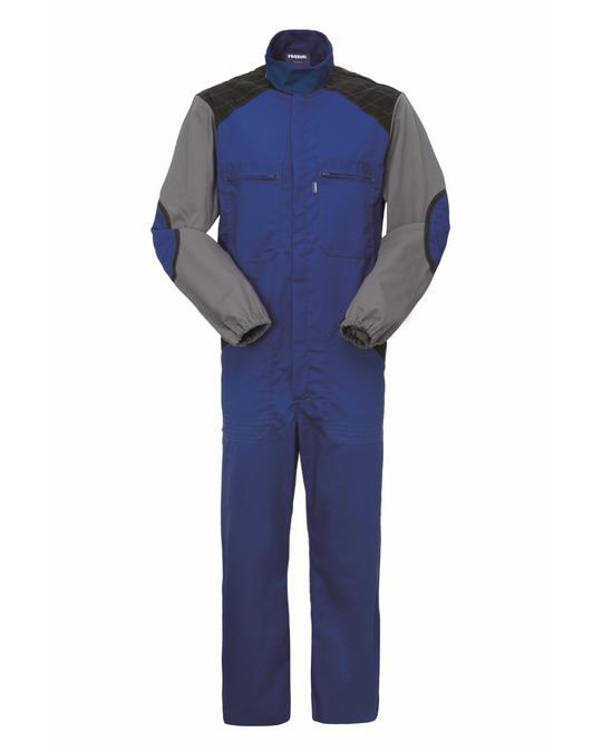 Tuta da lavoro con chiusura con cerniera centrale coperta, collo alla coreana chiuso con velcro. Due taschini applicati al petto chiusi con cerniera, due tasche inferiori applicate con profilo di colore a contrasto, elastico ai polsi. Elastico posteriore in vita e toppe sui gomiti, spalloni in tessuto di colore a contrasto con cuciture a rombi, inserto in rete sotto le ascelle. Gabardine, 65% poliestere, 35% cotone. Peso 245 g/m² I^ Categoria per rischi minimi