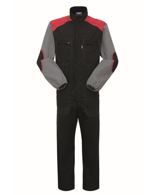 Tuta da lavoro con chiusura con cerniera centrale coperta, collo alla coreana chiuso con velcro. Due taschini applicati al petto chiusi con cerniera, due tasche inferiori applicate con profilo di colore a contrasto, elastico ai polsi. Elastico posteriore in vita e toppe sui gomiti, spalloni in tessuto di colore a contrasto con cuciture a rombi, inserto in rete sotto le ascelle. Gabardine, 65% poliestere, 35% cotone. Peso 245 g/m² I^ Categoria per rischi minimi