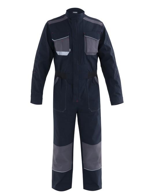 Tuta da lavoro multistagione in canvas stretch con collo alla coreana chiuso con velcro, chiusura centrale con cerniera in plastica coperta. Una tasca applicata al petto destro con inserto rifrangente, con portapenne e chiusa con aletta e velcro, una tasca applicata al petto sinistro con patella removibile per facilitare il ricamo chiusa con aletta e velcro, cuciture di rinforzo ai gomiti, polsi regolabili con velcro, elastico in vita, due tasche inferiori applicate, una tasca portametro applicata su gamba destra, una tasca posteriore a destra chiusa con aletta di colore a contrasto e velcro. Rinforzi di tessuto a contrasto sulle ginocchia e travette a contrasto, profilo rifrangente inserito nelle alette delle tasche e sotto le ginocchia. 98% cotone canvas 2% elastane Peso 270 g/m² Iº Categoria per rischi minimi